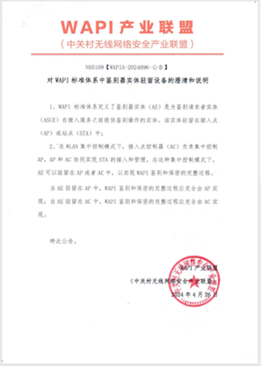 本着为财产市场担任的准绳,做为财产公共办事平台,增设AE驻留测试项。图:《WAPI市场使用洞察演讲——瘦AP组网架构下的WAPI产物工程化实现取摆设》对AE驻留问题进行了预警。以确保设备供给最佳的WAPI平安办事和体验。连系业界高质量平安无线局域网扶植需求,厂商通过沉测获得联盟最新测试演讲,联盟从支撑厂商产质量量跃升、办事市场扶植出发,能够申请免费从头测试。WAPI财产联盟于2024年4月发布了《对WAPI尺度系统中辨别器实体驻留设备的和申明》通知布告,2025年5月启动了针对AE驻留的WAPI瘦AP产物从头测试专项。
